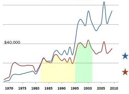 I didnt reach the third level of income (green tint) until the second half of the 1990s. Thats when I traveled a lot for Fox Sports Nets national telecasts, making $43,820 in 2000. Since 2002 Ive been working mostly around Pittsburgh (no tint). The only year I approached the 2000 earnings record was 2006, when I traveled with the Pirates for ten weeks of nonstop baseball. So theres my 40-year career in one graph. What does it all mean? Well, if I retire a couple of years from now, Social Security will send me monthly checks totaling $24,000 per year (blue star), which will be worth about $11,000 in 1983 dollars (red star). Until they run out of money, that is.