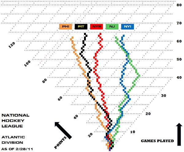 28, 2011 Two months ago, I introduced the chart I call the Ice Cube Road. As promised, below is an update, showing the standings of the National Hockey Leagues Atlantic Division through Sundays games. Philadelphia leads. Second-place Pittsburgh has a mediocre record lately, as do the two New York teams. But after a terrible start, New Jersey's surge over the last 20 games has lifted the Devils out of the cellar.