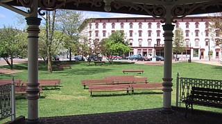 Theres also the old train station, and in the background an old hotel. The Bush House was built in 1868. On the right, we see it from the gazebo.