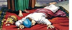 But the mob didn't harm The Twelve. The Apostles continued to preach. Although they had delegated the routine food distribution to the deacons, they themselves still handled the larger matters. When I sold a field I owned, I dutifully brought the money and laid it at the Apostles' feet. Acts 4:36-37~ How generous of you. I was only obeying the rules of the community. I was still present when a man named Ananias brought in another 400 shekels. It seems that he and his wife Sapphira had sold a piece of property similar to mine, but they didn't report all of their income. They secretly kept back part of the money for themselves. That's correct. Peter found out about this and confronted Ananias. How is it, he asked, that Satan has so filled your heart that you have lied to the Holy Spirit and have kept for yourself some of the money you received for the land? What made you think of doing such a thing? Ananias turned pale. Peter continued, You have lied, not just to human beings but to God!