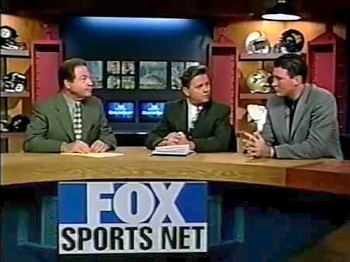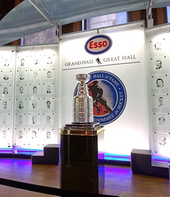 Of course, during my visit that morning there was nobody on the set. But a gleaming silver object had been placed right there in the middle of the desk! Could that be the Stanley Cup? The Stanley Cup? The actual Presentation Cup, not a studio prop? I stared at it for a few moments before noticing a man sitting quietly in the wings reading a newspaper. He must have been the Keeper, waiting for Stan and/or Guy to arrive and tape their bit or at least pose for photographs. Not wanting to alarm the Keeper's protective instincts, I didn't approach any closer, although I'm sure I could have done so. And that was my Stanley Cup encounter.