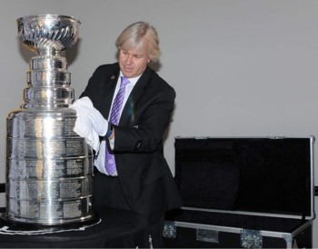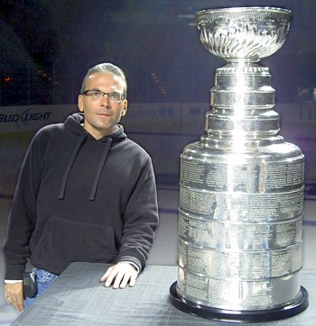 When a championship is won on the ice, each member of the winning team gets to raise the exact Cup he dreamt of raising as a child. His name will be engraved on the base, and he will be entitled to spend a day with the Cup in a place and manner of his choosing once including the bottom of a swimming pool at the home of Pittsburgh Penguins captain Mario Lemieux. During another of the trophy's trips to Pittsburgh, many of our TV crew got pictures taken with it. For example, below is long-time camera operator Rick Rhodes.