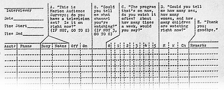 For the first couple of years of Marion CATV's operation, Channel 3 was mostly an automated weather-board service. However, following the FCC ruling last fall requiring CATV systems with more than 3,500 subscribers to begin local programming for real by 1971, the Marion system has built a small downtown studio. TV-3 began on a regular basis on June 1 of this year. It consists, at last report, of about 22 hours a week of live and video tape programs, including commercials, all produced in the Marion studios. Those hours fall between 10:00 a.m. and 12:00 noon and between 5:30 and 8:00 p.m., five days a week. Not all those 22 hours a week are unduplicated; for example, the "Jolly Jingles" children's show is presented live at 5:30 each afternoon, and a video tape of the same program is seen at 10:00 the next morning. Most programs are seen on each of the five days. Programs are generally half an hour or less in length; there's one that's only ten minutes. The goal of Marion CATV is to make TV-3 a self-supporting venture, rather than letting it operate at a loss and offset that loss with income from subscribers' fees. TV-3 is intended to bring in more money from advertising than it spends on programming, so it operates on a very low budget. Even with that, the figures are currently still in the red, for not all the available advertising time is being sold. This is hardly surprising; the local-origination service has just begun, and advertisers may well doubt that significant numbers of people are watching. Benefits of Gathering Data To prove that there is an actual audience, not just a potential audience of 6,000 homes, Marion CATV may find it advantageous to conduct a survey. This paper describes how this could be done, keeping in mind the condition that the cost should be as low as possible. There's a second reason for the survey: to show the TV-3 programmers what sort of public acceptance their current offerings are getting so that they can have some idea of what future offerings should be like. And there's a third reason, a side effect of the method described in this paper. If there are people who are not yet cable subscribers because they figure that they wouldn't watch those other eight (not-Columbus) channels enough to justify the expense, it will be possible to say to them something like this: "We took a survey and found that of the subscribers who had their sets on, 46% were watching something other than a Columbus station." A point like that might bring in a few additional subscribers. Goals This survey is intended to apply to all 22 hours during a week when TV-3 is programming. (It could be cut back to a smaller scope for budgetary considerations.) The suggested week is November 2 through 6, 1970, because that week is (1) relatively soon, (2) in a cold-weather, early-sunset month when the number of homes using television should be comparatively high, and (3) during the season when both political programs and the high school football films will be on the cable to draw larger audiences. The questions to be answered by the survey are these three: (1) During a given TV-3 program, how many homes in Marion are tuned to each of the twelve cable channels? (This should be expressed in an average homes figure. If, for example, a program is presented five days a week for half an hour each day, the average should be taken over the entire 2½-hour period.) (2) In those homes which are actually tuned to the TV-3 program, how many men, women, and children are watching at an average moment during the week? (3) Having determined the average audience at any given instant, what is the total audience (again in terms of homes, men, women, and children) that views a given TV-3 program at some time or other during the week? All the preceding questions are to be answered with numbers, not percentages. This is because TV-3's competitors are not the other eleven television channels but rather the local radio station and the local newspaper, at least when it comes to selling advertising to Marion advertisers. Therefore, traditional TV rating percentages are not as important as the number of actual viewers that an advertisement can reach. Method