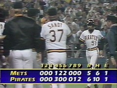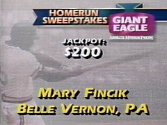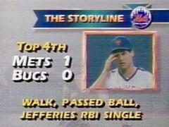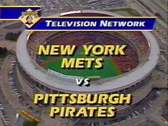 Pittsburgh is in yellow, Atlanta in blue or red, and other cities in gray (the "green" key). Often you'll have to abbreviate the cities. All of the above is high priority, because stills will be made from the Starting Pitcher, Lifetime Stats, and NL Leader panels. Lower priority uses which you can make of the stats include: 0100 Batting Averages for every player. Of course, this is lower priority only in the sense of scheduling your afternoon time; it still has to be done before we go on the air. 0300, 0305 Pitching Stats, two panels for every pitcher. a2270 Team Stats bar graphs if you have time.