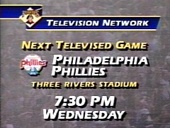 7:32 Coming back from break, Lonnie will almost always use 0040. This could be followed by a still, or by a Chyron like 1400 Copyright (also known as Disclaimer), 2160 Home Run Sweepstakes (also known as Giant Eagle), a0033 Quiz (also known as Equibank Challenge), or 0080 (for a change of announcers).