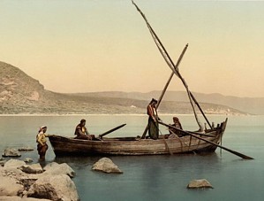 Often, when people hear about something they want to believe, like an allegation of a nefarious secret plot, they don't question it. They think it true without bothering to think it through. Such people really ought to learn the facts first and examine the evidence. Only then can there be a proper judgment. But no, they can't be troubled with those intermediate steps. They jump over the details and jump directly to the desired conclusion. And they have faith in their conclusion. They boast about their leap of faith, as though persuading oneself without proof were an admirable achievement! At the Lake My name is Zebedee, from the region of Galilee. I own a 26-foot fishing boat on the Lake of Gennesaret. My sons James and John used to be my crew. They weren't happy about it. I'm tired of working every night on this stupid old lake, James often complained. It's so small that a friend of mine walked all the way around it in a single day. John pointed out that there's a much bigger sea just one day's journey to the west. And there, I've heard, you can sail 2,000 miles farther west until you reach a land called Spain. I wasn't sure whether I could believe this tall tale. And beyond that is an even bigger sea that has no end! added James. They call it Ocean. I want to see these wonders. I want to see the world! No, my son, I said, your place is here with me. We are family. We are Galileans. Get in the boat. A Stranger Arrives One morning, after a long but mostly unsuccessful night of fishing, it was maintenance time. As the sun began to rise, we returned to shore to wash and mend our nets. Nearby was another boat belonging to Cephas and his brother Andrew. (In those days, Cephas was known as Simon Peter.) They too had been tending their nets.