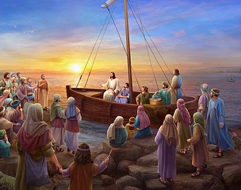 The homeless man wanted to join us. When we refused to let him come aboard, he ran off proclaiming that he had been healed. I don't know whether anyone believed that conclusion. Mark 5:1-20~ The First Communion Later, when Jesus heard the news that John the Baptist had been put to death, he was very sad. Matthew 14:12 Again he chartered my boat, this time to take him and the disciples to a remote place to rest and reflect. However, the people had seen us leave, and hundreds of them followed our progress and were waiting for us at the landing. Jesus couldn't help himself; he started to preach. Night was falling, and the disciples suggested that the people should leave and get dinner. But I'm not done teaching, he answered. Give them something to eat yourselves. What? they said. We brought only a little food with us, and buying enough for this crowd would cost 200 denarii! How much food do you have? he asked. Take a look. It turned out there were five big loaves of bread. Also, I was able to contribute a couple of fish. After a blessing, the disciples shredded the fish into sushi bits and tore the bread into little wafers. They passed the food around, and this symbolic meal seemed to be enough to satisfy the crowd. There were even leftovers.