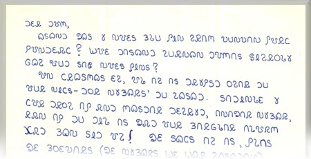 December 30, 1968 A year before, we had conducted a silly correspondence in a Runic alphabet. For this Christmas, I revived the idea but with a variation that I called Anti-Runic. Jan had no trouble decoding my letter and using my alphabet to reply with three pages like this: