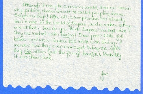 Although it may be a mans world, I see no reason why pinking shears should be called purpling shears. Enough is enough!