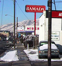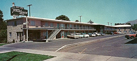 I was amazed to find the motel shown above, the Salt Lake Travelodge, still in operation across the street from the Olympic Medals Plaza at 144 West North Temple. What's amazing is that my parents and I stayed at this very motel on my only previous trip to Utah. See the 1959 postcard picture below.