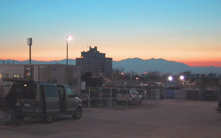 Here's a sunset over the mountains that surround Salt Lake City, as seen from our TV compound outside the Ceremonies. One day our van driver was from Dallas. She doesn't like Salt Lake, she told us, because the mountains make her feel claustrophobic. She prefers to be able to watch the sunset all the way down to the horizon.
