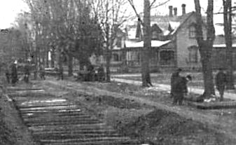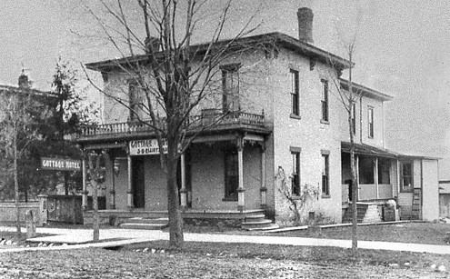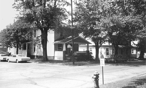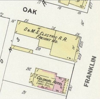 Next to the freight house was a hotel, complete with steam heat and electric lights for the convenience of the traveling public. Apparently the name was actually the Cottage Hotel. Notice the largest of the trees out front; we'll see it again later. Notice that the north half of Lot #212 is open space; we'll see used vehicles parked there later.