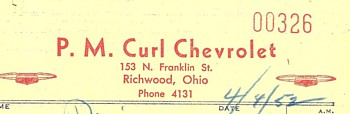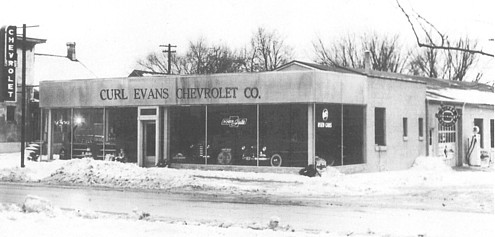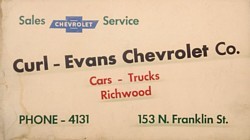 As the years went by, automobiles became the preferred form of transportation and there was no longer need for the interurban. Rail service had been reduced to one round trip per day, and it was discontinued entirely in 1933. A couple of years later, Paul M. Curl began selling Chevrolets in Richwood. By 1939, he was joined by Jay L. Evans as his salesman and assistant manager, and early in 1950 the two of them incorporated the dealership as the Curl-Evans Chevrolet Company. Where was that garage? Jay's grandson Wayne writes on Facebook, Originally, it was located at Pop's Pure Oil. I think that was around 120 North Franklin Street.