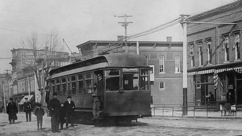 That may have been the original plan, but I don't think this particular railway ever went farther north than Richwood. Nor did it go farther south than Delaware. However, in that city a Richwood resident could board the Columbus, Delaware, and Marion line for connections to anywhere in the nation. Strang-Electric Railway refers to William B. Strang, who had very recently invented a gas-electric railroad car to connect Kansas City to his new suburb of Overland Park. However, the Richwood trolley was not a Strang, as it drew its electricity not from an onboard engine/generator (like a diesel locomotive) but from an overhead wire.