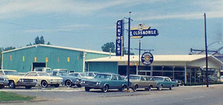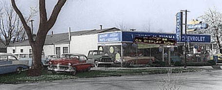 By 1953, the showroom was rearranged so a car could be displayed in the big left window, and a metal awning was installed over the front door. Most importantly, there was a new name on the façade! The colorized photo below shows that by the time the 1956 Chevys arrived, an Oldsmobile sign had been added to the Pole. Behind the big old tree where the Cottage Hotel had been, the OK Used Cars lot was still gravel at that time.