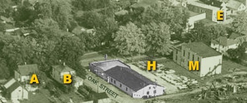 Here's an aerial view of the garage from the opposite direction. A and B are houses on the other side of Oak Street, with addresses something like 159 and 157 North Franklin. H is the former site of the Cottage Hotel, M is the Masonic Temple, and E is the original location (I think) of Curl-Evans Chevrolet. Unfortunately, in 1964 a great fire leveled the building at 153 North Franklin Street. But it didn't destroy the Sign Pole, and it didn't destroy Vernon M. Thomas Chevrolet & Oldsmobile. My father relocated the residents of A and B ...