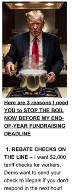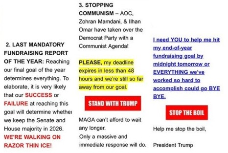 3, 2026 Some fundraisers like to set an arbitrary goal and an arbitrary target date, then challenge donors to reach that goal before the deadline. I received several such requests last month, many noting the practicality of hurrying up and making a charitable contribution while the 2025 tax deduction still was available. Others may have received the late-December pitch below, headlined Uh oh... Troubles are BOILING OVER. The post mentioned three Presidential deadlines.