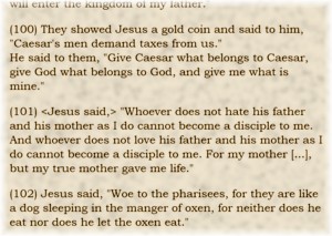 One of the men pulled a gold coin out of his purse and laid it on the table. Jesus studied it. Whose picture is this? he asked. Caesars, was the reply. All right then, Jesus said, give Caesar what is Caesars. The men looked at the coin unhappily. Jesus continued, Give God what is Gods. The men nodded solemnly. And, Jesus added, gleefully snatching the coin, give me what is mine!