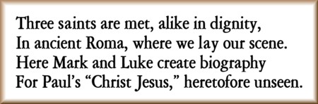 And the voice said, Saul, Saul, why do you persecute me? Who are you? I asked. The voice answered, I am Jesus. You think you're persecuting me, but kicking against the goad of truth will only hurt you. Now get up! Go on to Damascus! There youll be told what to do. When I arrived and recovered my sight, a highly respected Jew called Ananias was standing beside me. I described my experience to him, and he said God wanted me to tell the world. Not just the Jewish world, but the Gentiles as well. [Acts 22:6-15, 26:14] And did you tell the world? I asked. Immediately! I went off into the desert, to Arabia, without consulting a single person. I didnt even go up to Jerusalem to see the apostles there. Afterwards I returned to Damascus. [Galatians 1:16-17] Paul Rules Out Human Sources Youre saying you didnt learn about the Lord from eyewitnesses to his earthly life? Certainly not! said Paul. I want to make this clear: The good news I preach is not of human origin. No one gave it to me. No one taught it to me. I received it directly through a revelation of Jesus Christ! [Galatians 1:11-12] Have you had many such revelations? I hear voices all the time. I have been handed over to the courts and summoned to appear before governors and kings. But when Ive been on trial, Ive never worried about what I was going to say, because it is not I who speak but the Holy Spirit speaking through me. [Mark 13:9, 11] One night, while Silas and I were in Troas, I had a dream. A Macedonian man was standing there begging, Come over to Macedonia and help us. That clearly meant that God wanted us to sail across the Aegean Sea. [Acts 16:9-12] So we crossed over, fearing no danger, fearing no storm, because even wind and sea obey the Lord. [Mark 4:37-41] When we landed and met the Philippians, we felt sorry for them. They were like sheep without a shepherd. We began to teach them many things. [Mark 6:34] Yes, the heavenly Christ continually discloses further truth about himself to his followers. I know a man I dont want to boast, but this man was caught up as far as the third heaven. I dont know whether it was an actual physical experience; only God knows that. He was caught up into paradise, where he heard words that cannot be translated must not be translated into human speech. Im honestly proud of an experience like that. [2 Corinthians 12:2-5] Anyway, the apostle continued, we were recalling that first appearance. When I returned to Damascus I preached about Christ in their synagogues. The people were astonished at my teaching. Unlike the scribes they were used to hearing, I spoke with confident authority. [Mark 1:21] But they were suspicious because they knew Id come to their city to arrest Christians. Some of them wanted to murder me, but I escaped over the wall, and I did visit Jerusalem. [Acts 9:20-25] I stayed two weeks with Peter, but I saw none of the other Brethren of the Lord. Except James, that is. [Galatians 1:18-19] Those who were reputed to be pillars of the community imparted nothing further to me. [Galatians 2:6] As I was praying in the Temple, I fell into a trance again. I saw the Lord speaking to me. Leave Jerusalem quickly, he told me, for they will not accept your testimony about me. Go, for I mean to send you far away to the Gentiles. [Acts 22:17-21] My good news was nothing more than what Moses and the prophets told us would happen. I once explained this to King Agrippa, but Governor Festus called me crazy. He said my great learning was driving me insane. I dont think Im out of my mind. Do you? [Acts 26:22-25] No Interest in Biography I needed to pin Paul down on one point. So you never met the man Jesus, and you spoke only briefly to the pillars who might have done so when he was alive. You cant prove there ever was a man Jesus. Any details about his life here on earth mean nothing to me. I dont care about such things. To me, the Christ of Heaven is all. What do you mean? He had always been God by nature. That is why God has now lifted him so high. [Philippians 2:6, 9] The first man Adam came out of the earth, a material creature. The second Adam came from heaven and was the Lord himself. Flesh and blood can never possess the kingdom of God. [1 Corinthians 15:47-50] Nevertheless, Luke interjected, flesh and blood are important to those of us who are still on earth. There are many who are curious about what this Jesus was like while he was with us here below. Where did he live? What did he teach? Did he perform any mighty deeds? Where was he crucified? How long ago was this? Who was his wife? Does he have children still living among us? Entirely irrelevant, Paul snorted. We know from the scriptures that Christ Jesus assumed human form as a descendant of David, so this must have happened after Davids reign. [Romans 1:3] It must have happened sometime in the last thousand years. Beyond that fact who cares? I have resolved to concentrate entirely on Christ and his death upon the cross. [1 Corinthians 2:2] Even though we knew Christ as a man, since the resurrection we do not know him like that any longer. Our knowledge of men can no longer be based on their outward lives. [2 Corinthians 5:16] Making the Abstract Concrete But Paul, said Mark, I too have been thinking about Lukes concerns. People are asking about the life of Jesus, and weve been unable to give them any details. Perhaps we could create some details. Then we could tell the good news in narrative form, as an epic myth. A what? I asked. Hes talking about an allegory, explained Luke, showing off his Greek learning. Thats a story with a hidden meaning. Mark recalled his Greek philosophy. Plato wrote about a group of prisoners who spend their whole life chained in a cave. They see nothing of the outside world except some shadows on the cave wall. To them, those shadows are reality. Then a prisoner is freed from his chains and discovers the actual objects producing the shadows. And where is this cave? Nowhere. Its a fictional story. Then why 
