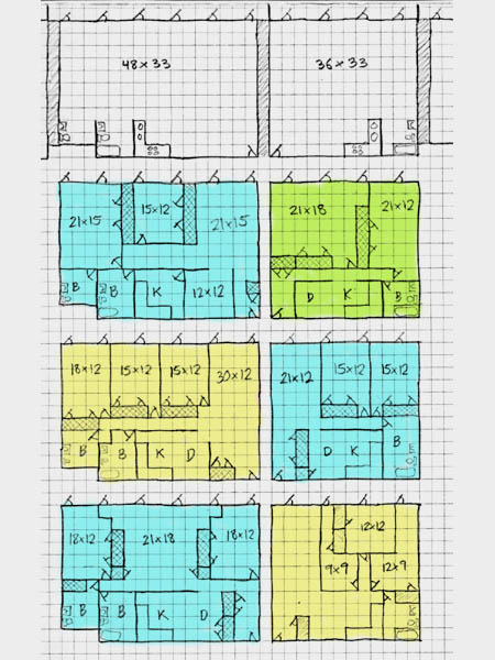 bedrooms (blue), or three bedrooms (yellow), in whatever arrangement