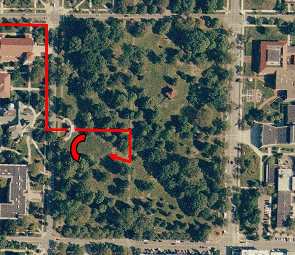 old processional route is marked with a red arrow on this overhead