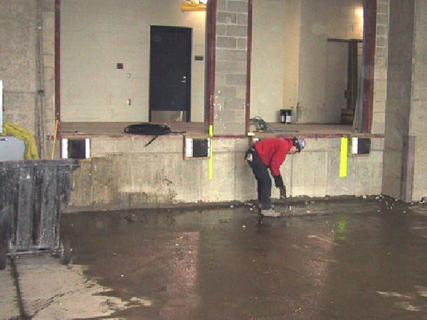 But the loading dock was not quite ready. First, the drain at the low end had to be cleaned out so that the construction mud and rainwater could be removed.