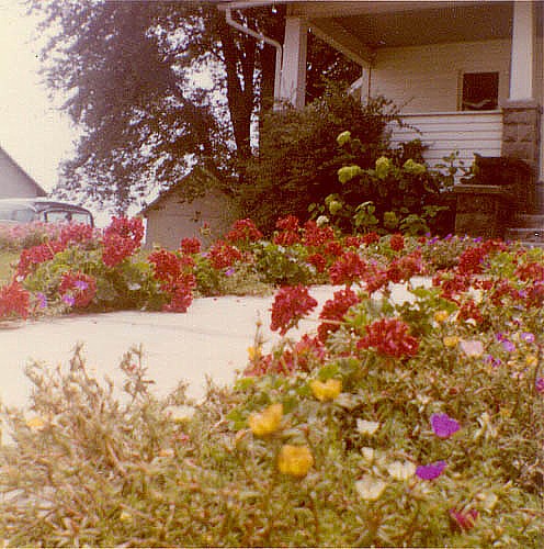 The front walk on Hoskins Pike was lined with flowers according to the season. Here, in the summer of 1958, geraniums and portulaca are in bloom.