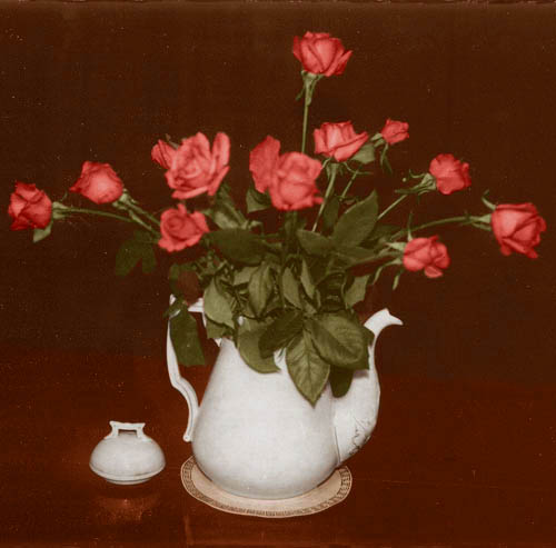 Mother sometimes cut some of her flowers, such as these roses, and brought them inside to make arrangements. (I colorized this 1962 photo in 2003.)