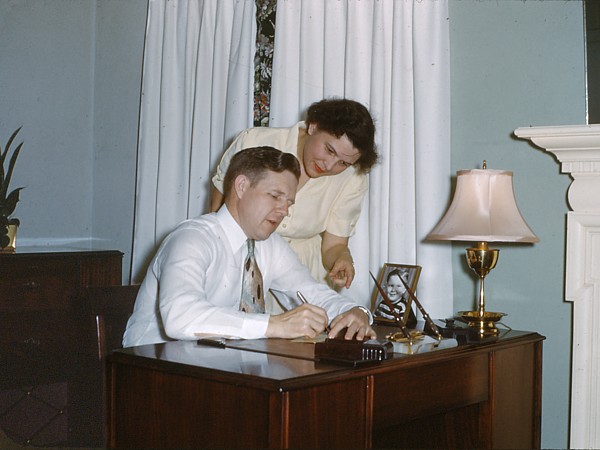 parents posed for this picture at the desk. Behind them is our