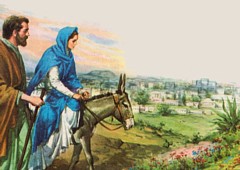 My next guest comes to us from the ancient town of Bethlehem, in Judea. And he brings with him an interesting account of a famous event that took place there more than 2,000 years ago. May I introduce Mr. Eli Davidson. Thank you, Brother Billy. I'm glad to be here. But to be perfectly correct, my name isn't really Eli. It's true that they call me Eli up north in Galilee, where my son's family lives. But my name is Heli, with an H. Yes, I see that now. IT'S IN THE BIBLE, the genealogy verses. Luke 3:23 Those Galileans drop their H's. They slur their speech all the time. But my son Joseph decided to relocate up there, and he fell in love with a local girl. Why did he move to Galilee? Well, Joe had always wanted to be a carpenter, and he heard there was an apprenticeship available in a little town called Nazareth. So he went there. He's so impetuous. He wasn't in Galilee even a year until he proposed marriage to the young woman. I've heard that her name is Mary. That's right. But before the wedding could take place, Mary discovered that she was two months pregnant. Joe was the father? No, he wasn't. I asked him about it and he swore they hadn't moved in together yet. In fact, Mary claimed that she was still a virgin! Those lying Galileans! My son is a man of principle. His first impulse was to have the marriage contract quietly set aside and to have nothing further to do with the immoral young woman. But he dreamed about an angel who told him that if he loved her, he ought to protect her reputation. He needed to go ahead and marry her and claim the baby as his own. So that's what he did. Matthew 1:18-25 IT'S IN THE BIBLE. So did you ever meet this Mary? Yes, the very next month. The emperor Augustus had issued an executive order: there was to be a worldwide census. You see, the Romans wanted to list all the people for taxation purposes. So Joe decided he should take some time off from work and come down here to register with his real family. Luke 2:1-5 Here in Bethlehem? Not in Nazareth? He had been away from home for only a year, and he still proudly identified himself as a Davidson. Yes, your family name indicates that you folks are descended from the first David, the ancient King of Israel. That's right. King David grew up right here in Bethlehem, you know. I Samuel 17:12-15 How far away from Nazareth are you? About 80 miles, or four days by donkey. Four and a half days if you count all the interrogation delays at the Customs and Border Protection checkpoint between Galilee and Judea. That took a little longer because Joe wasn't traveling alone. He wanted Mary to meet all his relatives, so he brought her with him. After all, by marrying him she was becoming a Davidson herself.