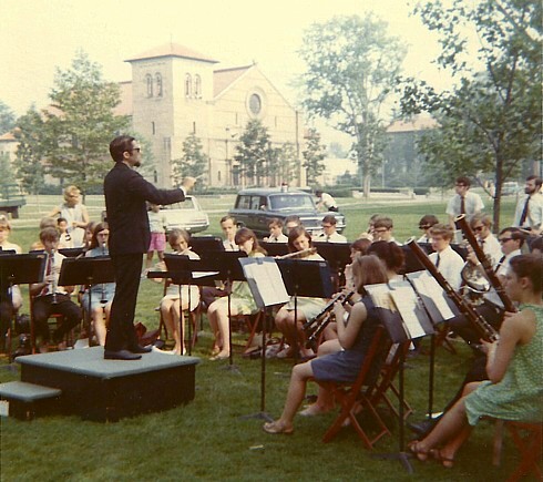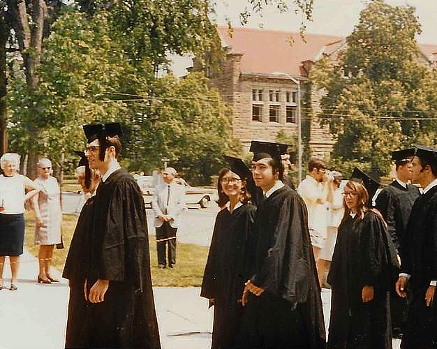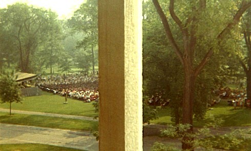 As Chairman Louie used to say, "Freeee! Freeee!" I took my one and only final exam this morning, and that completes my academic work at Oberlin. No more worries like that for three months. I don't even really care what I got on the final; I passed it all right, and that's all that matters. Done with physics! Saturday, May 31, 1969 During commencement week here, I really don't have that much to do other than write letters. The alumni have arrived. There are more alumni (and families) on campus now than students, since all sorts of classes are having their reunions. They're being housed in vacated dorm rooms and fed at Hi-C dining halls. Strangely enough, the quality of the food served by Hi-C has gotten much better since about Tuesday. Submarine sandwiches with three or four layers of lunchmeat instead of just one, excellent roast beef, well-cooked vegetables things that we students just aren't used to. And the waiters and waitresses are all wearing big nametags ("Sue" or "Pat" or "Bill") and big smiles. All this has the effect of introducing a bit of a credibility gap between the parents and the seniors, who have been complaining about the food in their letters home for four years now. |