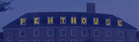 The fourth-floor section above us blacked out parts of their windows with cardboard, so that the nine dormer windows spelled out PENTHOUSE when the rooms behind them had their lights on. A nice ad for the fourth floor, but some of us third-center people resented it, so they secretly prepared cardboard for our nine windows which spelled out, if the lights were left off in three of the rooms, EATS IT. At the start of the open-house night we stationed people at each room's light switch and a conductor in the hall calling out the letters. [My room remained dark, but I was assigned to operate the switch at the door of my neighbor's room, the E.] As visitors approached Burton they saw spelled out in lights: