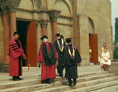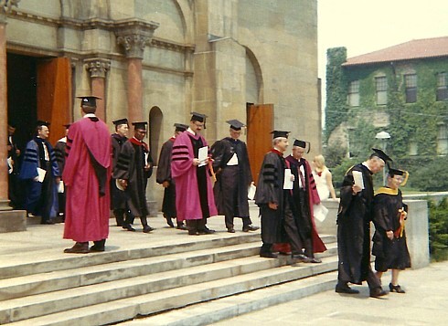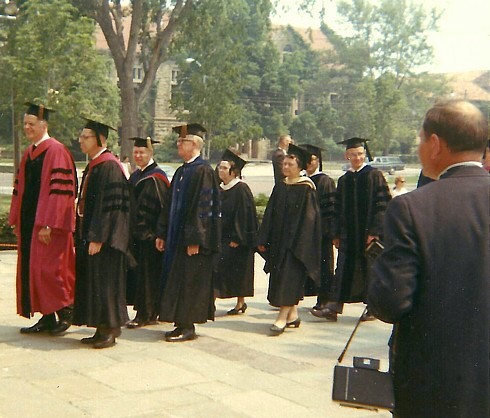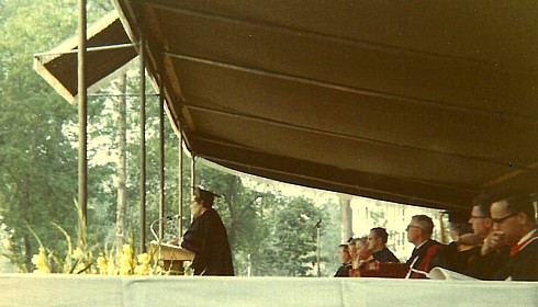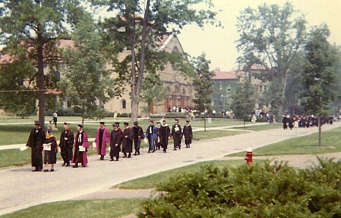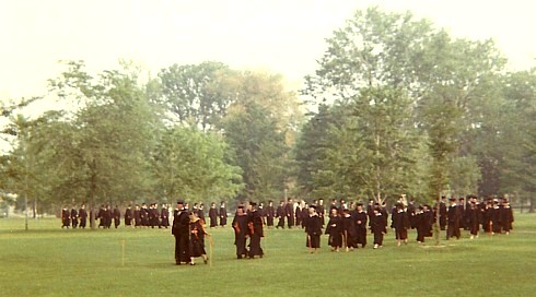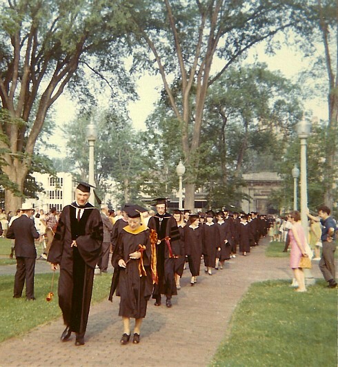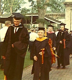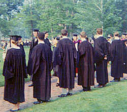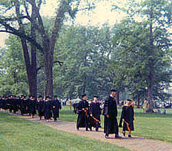 By this time the line has stopped. A double row of mortarboards stretches all the way back to the Arch, and there stands the President with some other officials. The Marshall says, "I guess we'll just have to go back and get him," so she and her escort turn around and start walking back down the line.