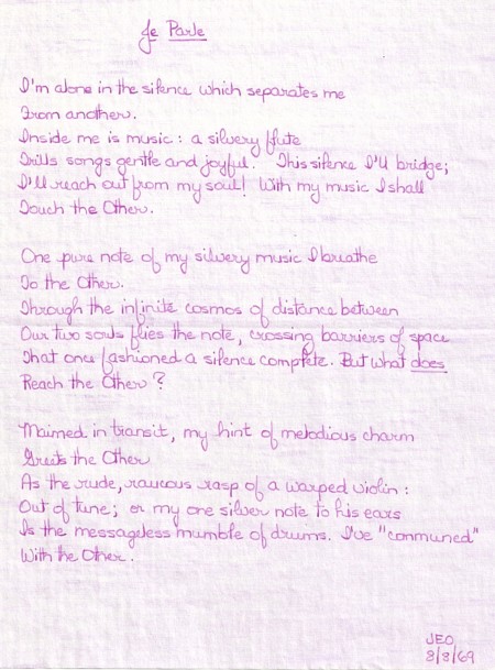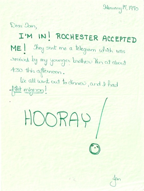 Sunday, November 23, 1969 Today I am feeling so happy that I can hardly bear it. Je crois que quelquun qui a pris mon couer me tient chère. Not knowing French, I showed this sentence to Su Morris, a classmate at Syracuse, and asked if she could translate it. I believe that someone who has captured my heart holds me dear, she said, giving me a strange look. My interview at Jefferson was rather blah. I only talked with one person. He said that Jefferson looks at grades and MCAT sores. My grades are un-extraordinary, although he admitted that my MCAT scores astounded him. I have appointments for interviews at my all-time favorite Rochester on December 15th. December 15th is one of my lucky days. That day (in 1964) was when I received my letter of acceptance from Oberlin.