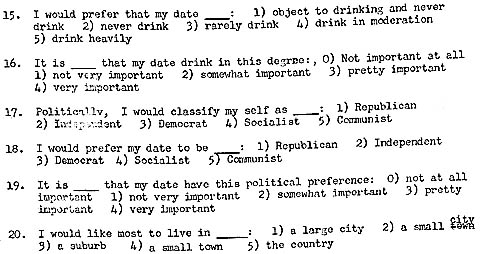 went back up to WOBC, where I had been just a few minutes be We kept up a running joke all evening, with me introducing him as my date and him warning me not to get too forward, and so on. When the faculty show was over about ten, we went back to WOBC and helped join in the jollity at the open house. For about half an hour after the show, there must have been a couple of hundred people in the studios or at least it seemed that way. Around eleven things thinned out, so I came back to Noah. I probably enjoyed myself more the way it worked out. I have a feeling that it would have been an effort to keep the evening moving along smoothly with this girl. To compare it with something I'm more familiar with, radio interviews, there are some interviewees who can take a simple question and give a complete answer that actually answers far more than you asked, including things you might not have thought to have asked; it's easy to conduct a good interview with these people. On the other hand, the interviewer almost has to drag answers out of other interviewees; they answer the questions in as few words as possible, and then you have to prod them again to get them to talk again. Now when I was in high school I was probably of this second type, but I'm gradually learning to become more open, talkative, personable, or whatever you want to call it at least outwardly. This has been helped along by knowing popular girls with whom it's necessary to be outgoing if you're going to sustain their interest. But inwardly I haven't changed that much, so I filled out the computer-date questionnaire with answers like "I'm usually guarded and reserved," "I prefer to be by myself," and so on true enough answers, but the girl I'm matched up with is probably the same way, and I'm not exactly looking for someone else who has trouble being outgoing. Of course it isn't fair to rate this girl on the basis of a two-minute conversation. Things might have worked out well, but I have a feeling it would not have come naturally for either of us.