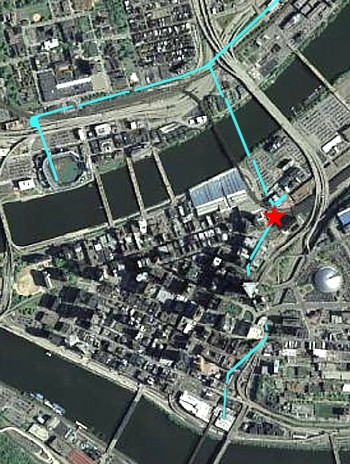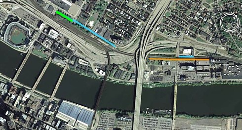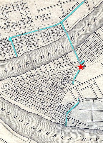 Then it was back to the rails for a 36-mile portage across the mountains. The Allegheny Portage Railroad hauled the canal boats up and down the slopes on ten inclined planes, each with a stationary steam engine to power the ropes. However, the ropes wore out, and sometimes they broke with disastrous results. John Roebling, an immigrant from Germany now living near Pittsburgh, replaced them with iron cables, called "wire rope," made by hand on his Saxonburg farm. Pennsylvania's canal resumed at Johnstown, following the Conemaugh River, which flows into the Kiskiminetas River. From Freeport the waterway would follow the Allegheny River to Pittsburgh. But on which side of the river should it be built? At that time, the part of Pittsburgh north of the river was actually a separate municipality called Allegheny. Residents of Allegheny wanted the canal to follow the north bank and end in their town; Pittsburgh residents wanted it to follow the south bank and end in Pittsburgh proper. The state decided on the north bank, where the flood plain was broader. But they agreed to branch the canal and built two terminals, one in each town. An 1828 city map shows the western end of the canal, highlighted below in blue. The northern branch through the borough of Allegheny presented few problems. However, to reach Pittsburgh the southern branch had to cross over the river on a bridge, called an aqueduct, from Voeghtly Street to 11th Street.
