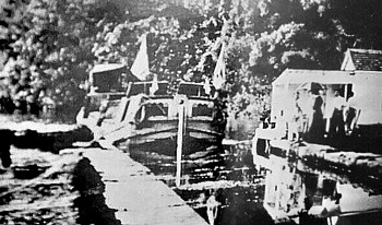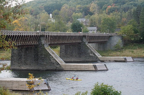 An innovative bridge of stone and wood and iron once crossed the Allegheny at this spot. Surprisingly, its purpose was to provide not a dry path for vehicles, but another waterway for boats!