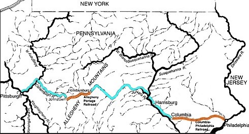 A packet boat like this requires calm water. The sides of the channel have to be steep, so that the boat can get close to the towpath and its motive power a mule. A canal can be built to these specifications, while a wild river would complicate operations with its currents, shoals, rapids, and shallow banks. But the Main Line of Public Works was not merely a canal. It actually began with a horse-drawn railroad, leading westward from Philadelphia, through the suburbs still known as the "Main Line," past Lancaster to Columbia on the Susquehanna River. There the waterway began. It had to be separate from the rivers, but it followed them closely by building on the level river banks. The route followed first the Susquehanna River and then its tributary the Juniata to Hollidaysburg.