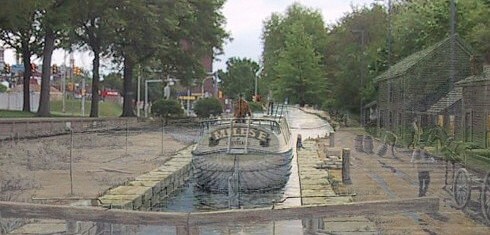 . . . I imagine a ghostly canal boat from long ago, as in a painting by William McGrath. In 1817, New York State started construction on the Erie Canal between the Hudson River and the Great Lakes. Completed in 1825, this waterway was highly successful, carrying passengers and freight between Albany and Buffalo. Pennsylvania decided it needed a canal of its own. The next year, 1826, construction began on the Main Line of Public Works connecting Philadelphia to Pittsburgh. Its completion in 1834 shortened the trip dramatically. Passengers and goods could now be moved more than six times faster than before. It used to take 23 days to cross the state by freight wagon. On the Main Line, it now took only 3½ days. But this Pennsylvania Canal became obsolete in 1854 when the new steam-powered Pennsylvania Railroad sped up the trip by another factor of six, reducing the time to 13 hours. The railroad bought the canal and shut it down in 1857. However, one thing bothered me about the canal in Pittsburgh. Why did the route run along the North Shore? There's a perfectly good river less than a quarter mile away. Barges ply it even today. Why would anybody build a canal parallel to a river? Well, there were no diesel-powered towboats in the 19th century. Considering the technology that was available, the canal made operations much easier.