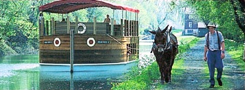 But the depth of the river varies with the seasons; therefore, locks would have been necessary on each end to raise and lower the craft between canal level and river level. Also, remember that canal boats didn't operate well in rivers, so it was usually necessary to build a slackwater dam across the river to give them a current-free pool in which to navigate. (Unfortunately, the dam then interfered with other river navigation, such as rafts of timber floating downstream.) The mules were unhitched and loaded onto a ferry. The boatsman would either trust his craft's momentum to carry him to the far shore, or propel the boat by pushing a long pole against the bottom, or grab a rope strung from shore to shore and pull the boat across. All of these disruptions created a bottleneck that could slow a boat's passage by a day or two. It was a much better idea to continue the canal uninterrupted on a bridge. Pittsburgh's first such bridge was a covered wooden aqueduct, completed in 1829. English novelist Charles Dickens and his wife used that aqueduct when traveling to Pittsburgh via canal boat in the spring of 1842. In American Notes for General Circulation, he wrote that on Monday, March 28, furnace fires and clanking hammers on the banks of the canal warned us that we approached the termination of this part of our journey. After going through another dreamy place a long aqueduct across the Alleghany River, which was ... a vast, low, wooden chamber full of water we emerged upon that ugly confusion of backs of buildings and crazy galleries and stairs, which always abuts on water, whether it be river, sea, canal, or ditch: and were at Pittsburg. Pittsburg is like Birmingham in England; at least its townspeople say so. ... It certainly has a great quantity of smoke hanging about it, and is famous for its iron-works. Ulysses S. Grant wrote of taking the canal in the opposite direction, when travelling from Ohio to enroll at West Point in May 1839. From Pittsburg I chose passage by the canal to Harrisburg, rather than by the more expeditious stage. This gave a better opportunity of enjoying the fine scenery of Westen Pennsylvania, and I had rather a dread of reaching my destination at all. At the time the canal was much patronized by travellers, and, with the comfortable packets of the period, no mode of conveyance could be more pleasant when time was not an object. From Harrisburg to Philadelphia there was a railroad, the first Grant had ever seen. I thought the perfection of rapid transit had been reached. We travelled at least 18 miles an hour when at full speed and made the whole distance averaging probably as much as 12 miles an hour. This seemed like annihilating space.