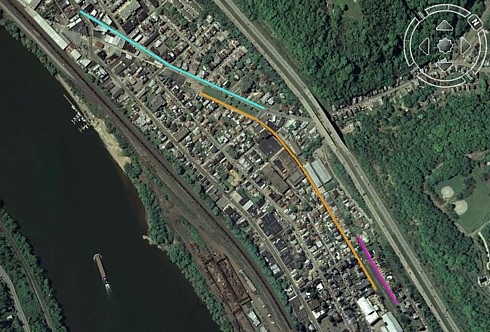 Walking east from Federal Street and the parking lot (marked green above), we swerve slightly to the north and find that we're now on North Canal Street (blue). Further east, beyond the ramps of the Veterans Bridge, we encounter South Canal Street (orange). I suspect that North and South Canal got their names because they bordered the east-west waterway. Five miles up the Allegheny, there are more clues in Sharpsburg (below).