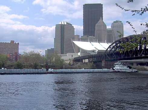 a towboat pushes barges up the Allegheny River in Pittsburgh.