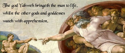 And behold, we other gods mocked the monster that Yahweh had molded, saying, What thou hast formed resembleth us not. The god Ea said, I believe it doth look quite like me. But I said, Not so, for thou hast given it my nose. 2:8 And the god Yahweh planted a garden eastward in Eden; and there he put the man whom he had formed. And I made bold to confront the god Yahweh, saying, Thou hast created heaven and earth and a garden, and in that sandbox thou hast placed a creature and given unto him life. Now thy play must be at an end. But the god Yahweh had not completed his work. He said, The man must have somewhat to eat. Let there be fruit. 2:9 And out of the ground made the god Yahweh to grow every tree that is pleasant to the sight, and good for food; the tree of Life also in the midst of the garden, and the tree of Knowledge of Good and Evil. We other gods cried unto Yahweh, Thou hast surely gone too far. If the man which thou hast made should eat from the tree of Life, he will live forever! And if the man should eat from the tree of Knowledge of Good and Evil, nothing will be hidden from him. He will no longer merely have the appearance of a god, but will become like us in every way. We gods can abide no rivals. Fear not, said the god Yahweh. Am I not the mans creator? Verily, he must obey my every command. I shall teach him that he must never touch either of these trees. The First Commandment 2:16 And the god Yahweh commanded the man, saying, Of every tree of the garden thou mayest freely eat, 2:17 But of the tree of the Knowledge of Good and Evil, thou shalt not eat of it; for in the day that thou eatest thereof thou shalt surely die. We reminded the god Yahweh, Forget not the other tree yonder. Thou must likewise command him not to eat of that tree, the tree of Life. But the god Yahweh heeded us not; for he now had taken in mind to make yet more creatures to move about upon the earth. More Creatures 2:18 And the god Yahweh said, It is not good that the man should be alone; I will make him an help meet for him. 2:19 And out of the ground the god Yahweh formed every beast of the field, and every fowl of the air; and brought them unto the man to see what he would call them: and whatsoever the man called every living creature, that was the name thereof. 2:20 And Adam gave names to all cattle, and to the fowl of the air, and to every beast of the field; but for Adam there was not found an help meet for him. And in their turn the living creatures came unto the man, asking, Thou hast named us; what is thy name? And he answered them, I am The Man (or, in the Hebrew tongue, Adam). And Adam inquired of the creatures what they found good for food. The cattle answered, We eat the grass that groweth upon the ground. But the grass pleased Adam not. The birds answered, We eat every creeping thing that creepeth upon the earth. But the creeping things were an abomination unto Adam. Then the creatures asked the man, What dost thou eat? He answered, saying, The god Yahweh hath told me I may eat the fruit of every tree that groweth here in the garden. But of the tree of Knowledge of Good and Evil, I must not eat thereof, lest I die. Yet Another Creature Now the god Yahweh was not yet satisfied with his creation, for he had failed to make a beast that would be a fit companion unto the man. 2:21 And the god Yahweh caused a deep sleep to fall upon Adam, and he slept; and he took one of his ribs, and closed up the flesh instead thereof. 2:22 And the rib, which the god Yahweh had taken from man, made he a woman, and brought her unto the man. And behold, the woman was indeed an help meet for the man. She became a wife unto him. He showed unto her the garden and everything that greweth therein, both the fruits which were forbidden and those of which they might freely eat. Breaking the Commandment 3:1 Now the serpent was more devious than any beast of the field which the god Yahweh had made. And he said unto the woman, Is it true that God hath said, Ye shall not eat of every tree of the garden? 3:2 And the woman said unto the serpent, We may eat of the fruit of the trees of the garden, 3:3 But of the fruit of the tree which is in the midst of the garden, God hath said, Ye shall not eat of it, neither shall ye touch it, lest ye die. The serpent secretly rejoiced to hear this saying. For if the man and the woman did eat the fruit and were poisoned thereby and did die, then the serpent and the other beasts would inherit the whole garden as a possession. But he told this not unto the woman. Moreover, he revealed unto her that the god Yahweh was a liar. 3:4 And the serpent said unto the woman, Of course ye shall not die, 3:5 For God doth know that in the day ye eat thereof, then your eyes shall be opened, and ye shall be as gods, knowing good and evil. 3:6 And when the woman saw that the tree was good for food, and that it was pleasant to the eyes, and a tree to be desired to make one wise, she took of the fruit thereof and did eat, and gave also unto her husband with her, and he did eat. 3:7 And the eyes of them both were opened, and they knew that they were naked; and they sewed fig leaves together and made themselves aprons. Yahwehs Regrets 3:22 And the god Yahweh said, Behold, the man is become as one of us, to know good and evil. And now, what if he should put forth his hand and take also of the tree of Life, and eat, and live forever? And the other gods answered, Did we not warn thee that this would come to pass? And we all cried out with a great clamor that Adam must no longer dwell nigh unto the tree of Life. 3:23 Therefore the god Yahweh sent him forth from the garden of Eden, to till the ground from whence he was taken. Behold, the time would come when Yahweh would so love the world that he would give his only begotten son, that whosoever believeth in him should not perish but have everlasting life. But that would not come to pass until after many generations, thousands of years later. Now, in Eden, Yahweh 