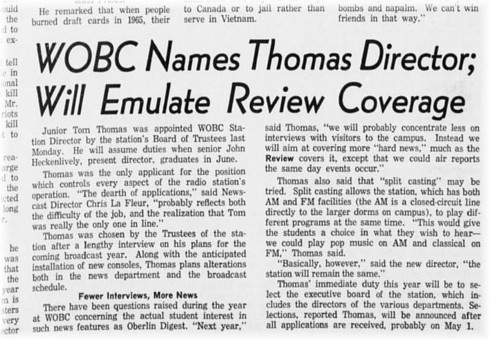 I was assembling my cabinet: a Program Director, two engineers, two business types, a Program Guide editor, and department heads for news, sports, classical music, popular music, fine arts, and public service. I solicited applications from current WOBC staffers, and if more than one person applied for a position, I had to decide (with advice from others) who should get the job. The final list was to be approved by the Board of Trustees on May 9.