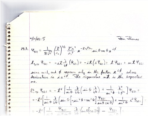 Don't Forget the Physics My scientific education continued. Two weeks later, I turned in my solutions to a physics problem set. Here's part of Page 5. I think these equations describe quantum wave functions. Back then, I actually knew what an eigenvalue was.