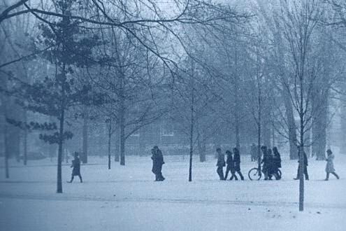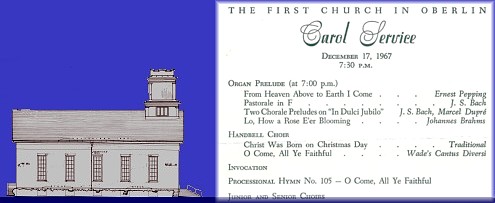 Holiday Season The following Sunday afternoon, December 17, instructor James Brown welcomed my math class to supper at his modern house in the southwest quadrant of town. His wife mentioned their previous home in Wisconsin. There, when they introduced themselves as Mr. and Mrs. Brown, they were invariably asked How do you spell that? Seems odd, but many Wisconsinites are named Braun and use the German pronunciation with au pronounced ow as in sauerkraut. Jan Olson was also in Mr. Brown's class. We both attended the supper, and she helped out a little in the kitchen. Afterwards, Jan and I walked back to campus for the evening Christmas carol service presented by the three choirs of The First Church in Oberlin.