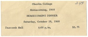 Homecoming 1968 Our next football game, on October 19, would be part of the homecoming weekend. Jan wrote out a dining hall announcement on behalf of the Social Board. It promoted Open Wilder on Friday from 7:30 to midnight. There would be folk dancing and singing, poetry readings, three 1930s movies for only 25¢, and a Multi-Media Arts Environment on Wilder's second floor.