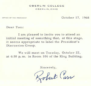 It was Saturday, October 5. Oberlin College's football team, having eked out a comeback win at Hiram the previous week their first opening-game victory in seven years now were playing at Carnegie-Mellon University in Pittsburgh. It was also our second broadcast of the season on WOBC. Again we were coming down to an exciting finish. The game was tied 28-28 late in the fourth quarter. It might end that way; the NCAA would not institute overtime until 28 years later. Oberlin had already used two of its time outs, but sophomore quarterback Dan Duffey was working the clock with a brilliant display of running and passing (according to Cary Seidman in the Oberlin Review). I recall at least one reception near the far sideline by tight end Pat Donlon, who had been in a German class with me when we were sophomores. With the Yeomen driving from left to right on your radio dial, I was on a roll as I called the game. My analyst, Jeff Hanna, was sitting beside me. We shared a single hand-held stick microphone. There had been a rule change for 1968: On a first down, the clock was stopped until the chains had been moved and the ball was marked ready for play. I had wondered how to describe that concisely, but it turned out to be no problem: Only 32 seconds left in the game! The clock has stopped for the first down. Now it starts again! Oberlin reached the 10-yard line, and the running clock reached 10 seconds. Then Carnegie-Mellon's rattled defense surprised everyone by calling time out. My analyst held out his hand to ask for the mic. Jeff speculated about what Coach Bill Grice could do. The Yeomen might throw a pass into the end zone, and if it fell incomplete they would still have time to try for a field goal. But Grice decided to play it safe. Jeff told our listeners that placekicker Steve Ashton had come on to attempt a 27-yarder.
