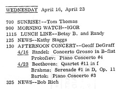 We also sold a bit of print advertising. On the cover of the Program Guide were the words, Brought to you by CO-OP BOOKSTORE. On the back, the store at 37 West College Street plugged its classical, jazz, folk records at discount prices; sheet music; music and art supplies; picture framing; and Oberlin seal items. This advertising helped defray our costs so we could distribute the Guide free of charge. Nevertheless, other budget problems arose during my senior year, forcing us to switch to biweekly publication.