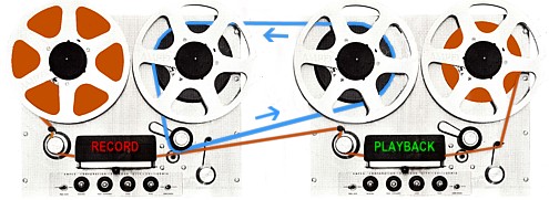 I mentioned this solution in connection with a later visit to WNBC in New York. Before putting phone conversations on the air, we recorded them using our left-hand tape deck. Then the tape, depicted below in brown, continued on to the right-hand deck. There, having traveled about 26 inches at 3¾ inches per second, it would be played back on the air seven seconds after having been recorded unless in the interim the engineer had detected an obscenity and switched to some other source.